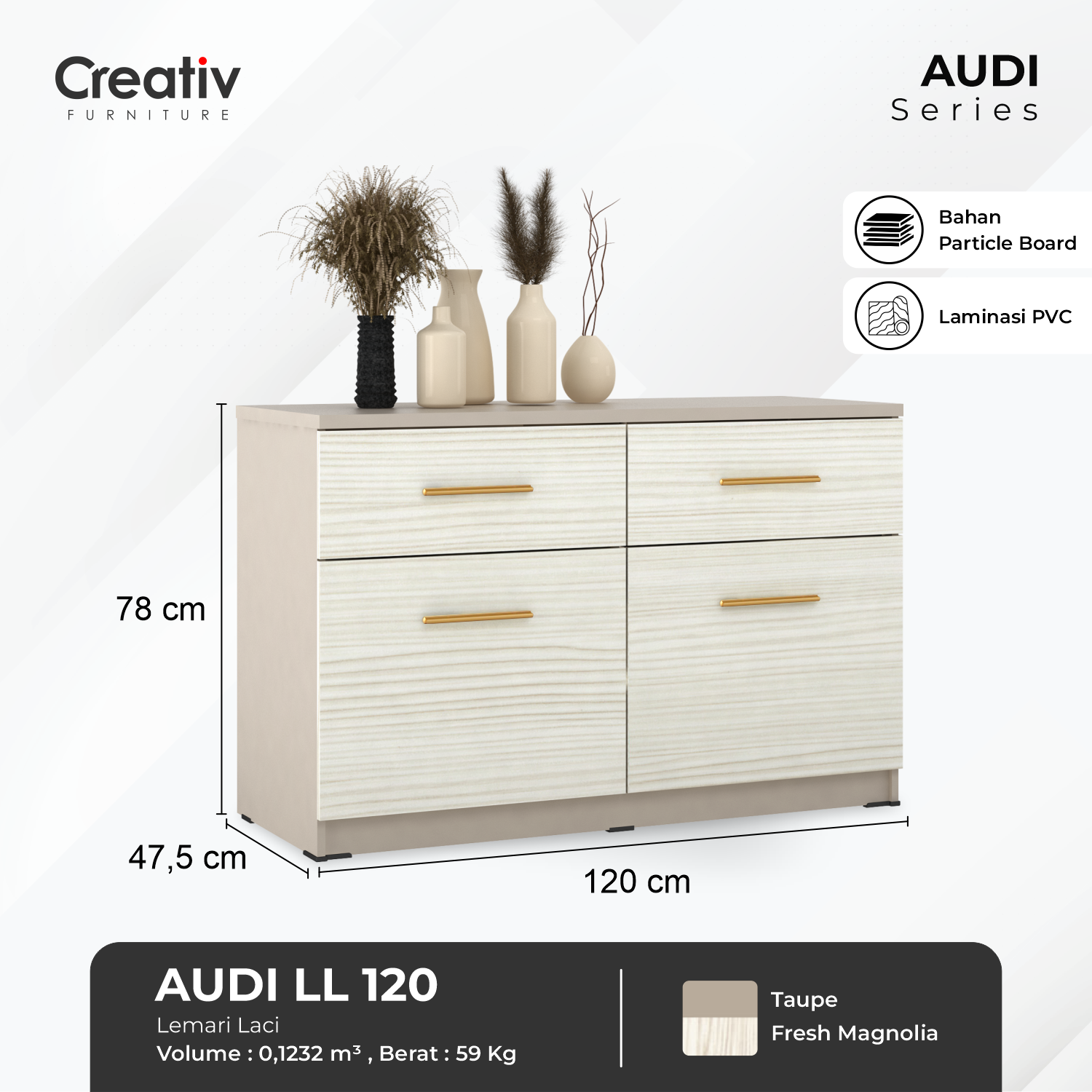 Lemari Laci Audi LL 120, hadir melengkapi ruang keluarga Anda. Mengusung konsep Smart & Beauty Inside Out serta warna Taupe & Fresh Magnolia yang Elegant, menjadikan tampilan rumah tampak semakin Aesthetic. Lemari Laci ini bahan yang super kuat, penyimpanan laci yang luas dengan mekanisme Soft Closing yang Smooth dan hidden storage yang cocok untuk menyimpan barang pribadimu. Wujudkan rumah dengan tampilan Elegant bersama Lemari Laci Audi Series terbaru dari Creativ Furniture.