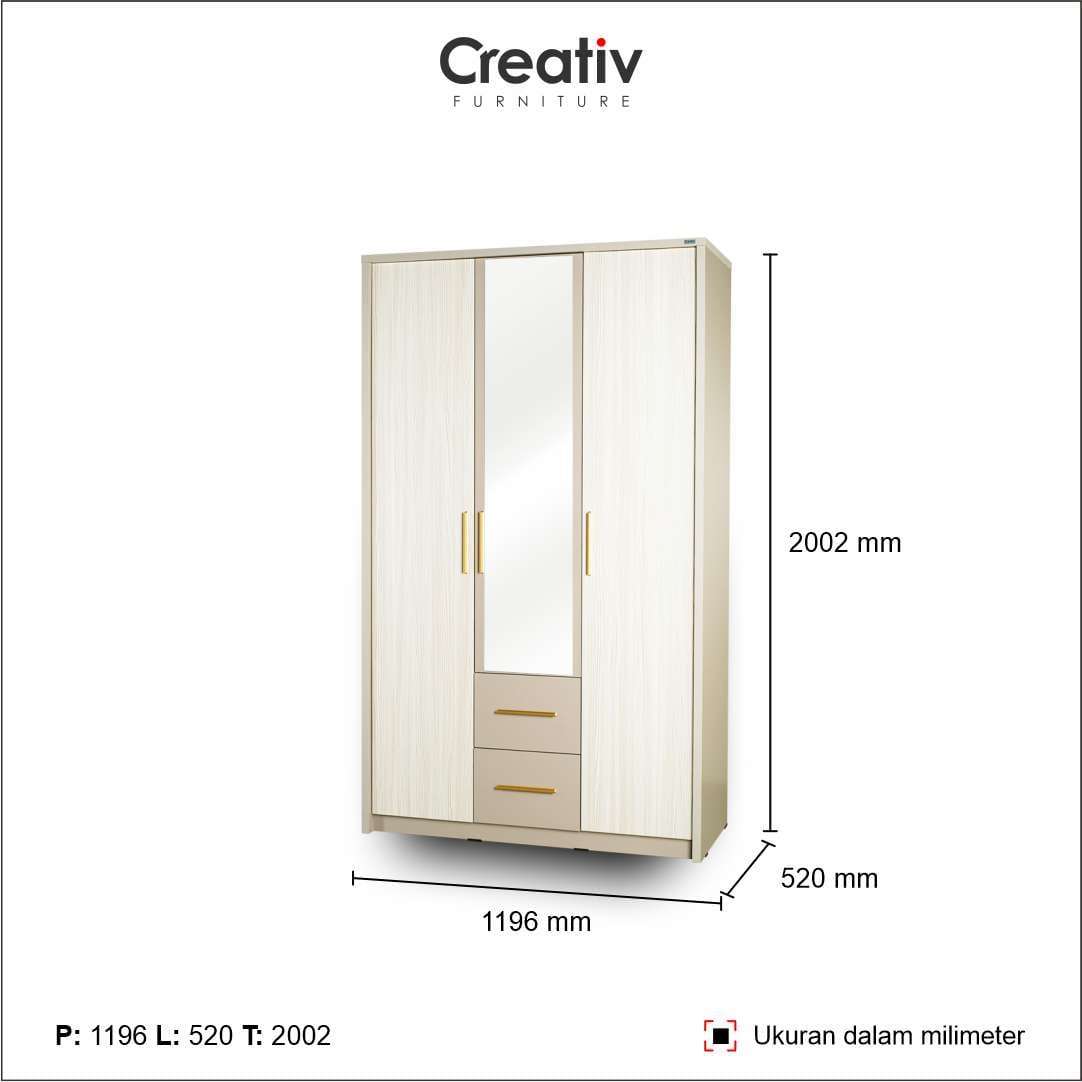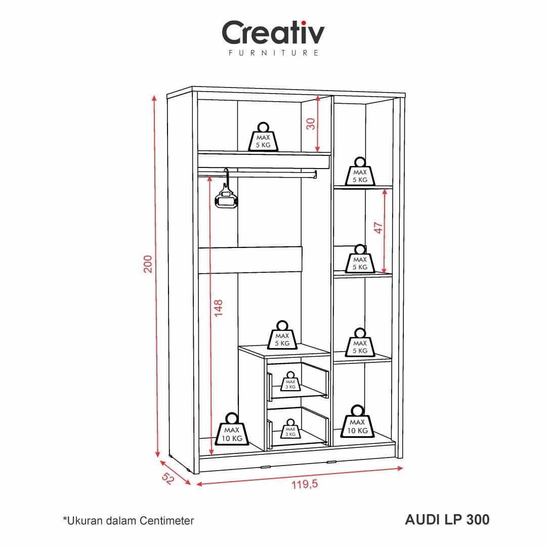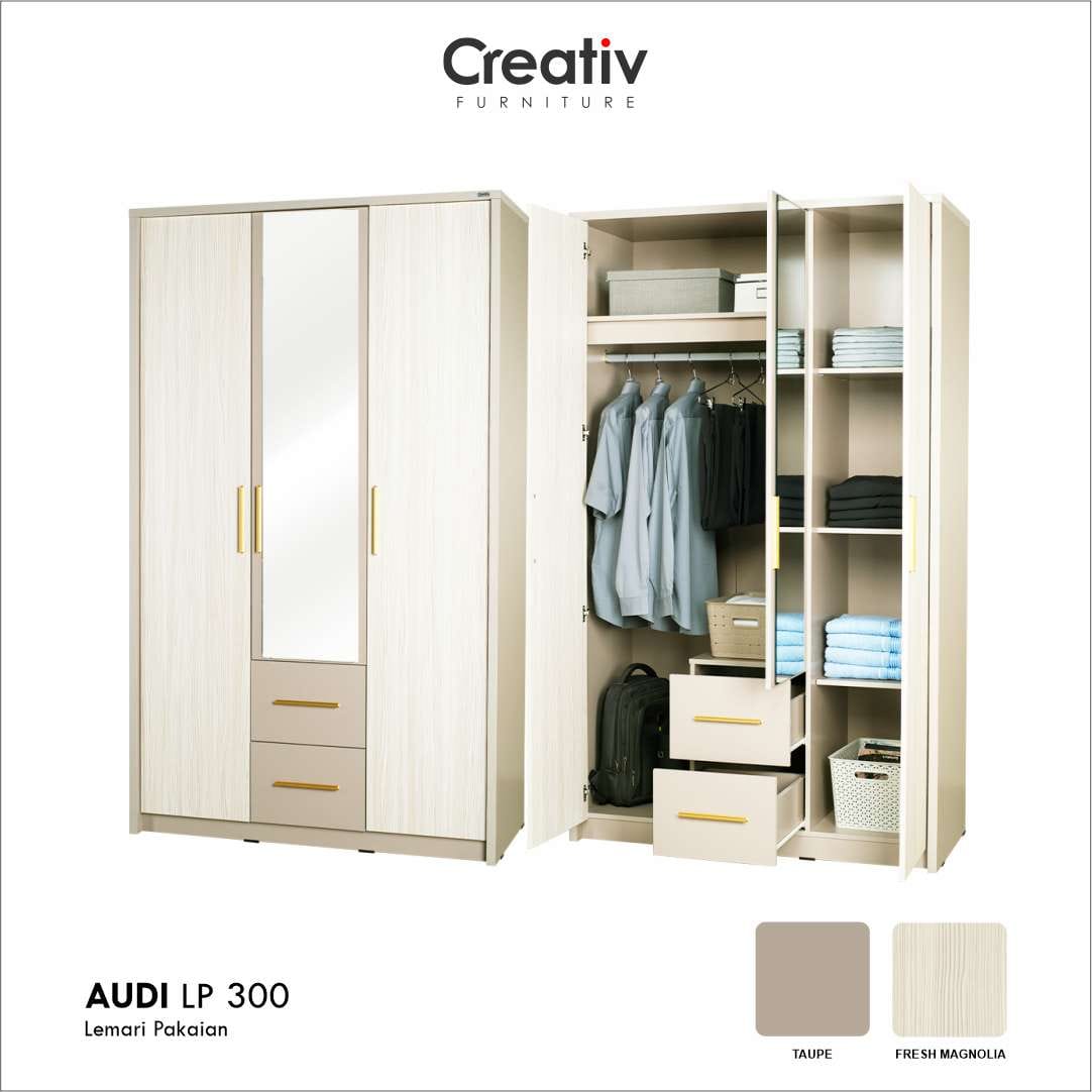 AUDI LP 300 produk baru dengan tampilan lebih fresh dengan tema desain luxury & desert modern. Lemari Pakaian ini memiliki banyak pilihan penyimpanan untuk memenuhi kebutuhan Anda. Desain Lemari menggunakan warna trend saat ini yaitu Taupe & Fresh Magnolia. Dengan tone warna hangat dipadukan serat kayu terang emboss 3D. Sesuai dengan trend interior dan hunian saat ini yang didominasi warna beige & earthy.