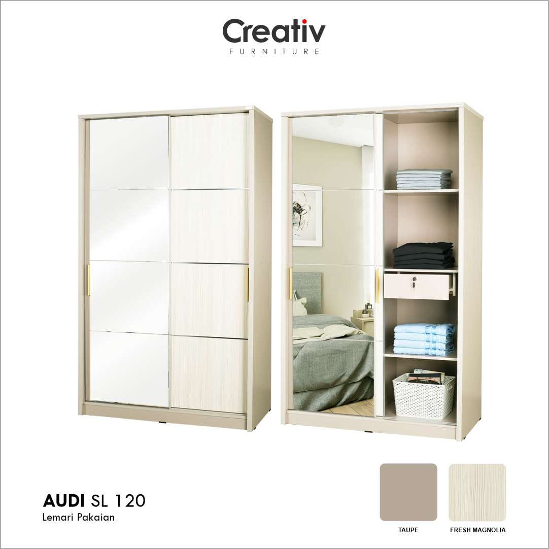 AUDI SL 120 produk baru dengan tampilan lebih fresh dengan tema desain luxury & desert modern. Lemari Pakaian ini memiliki banyak pilihan penyimpanan untuk memenuhi kebutuhan Anda. Pintu Lemari menggunakan mekanisme sliding serta Desain Lemari menggunakan warna trend saat ini yaitu Taupe & Fresh Magnolia. Dengan tone warna hangat dipadukan serat kayu terang emboss 3D. Sesuai dengan trend interior dan hunian saat ini yang didominasi warna beige & earthy.