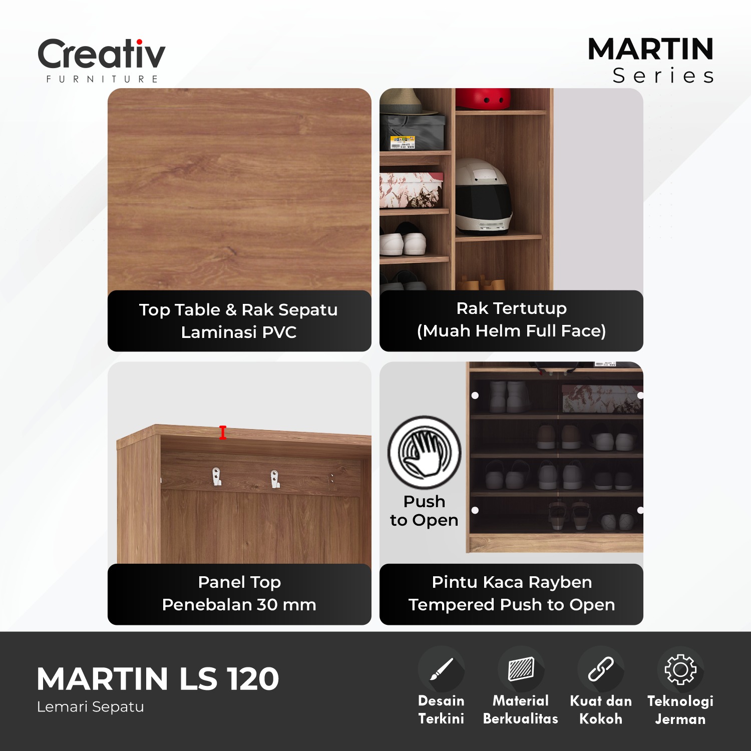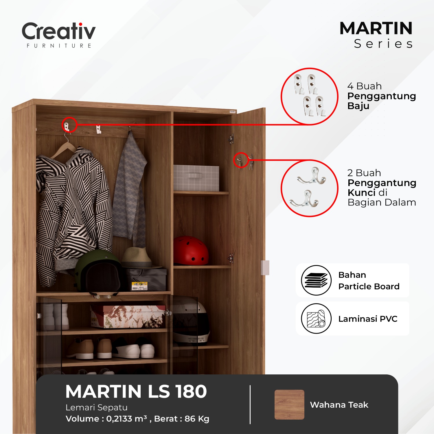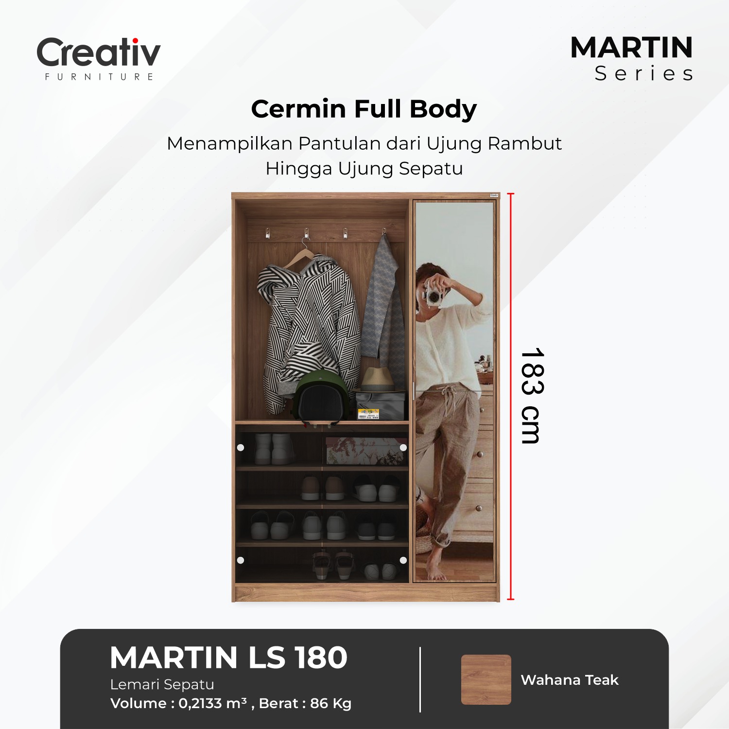 Lemari Sepatu Martin LS 180, hadir melengkapi kebutuhan alas kaki Anda. Menggunakan warna kayu Wahana Teak yang Alami, menjadikan tampilan rumah tampak semakin Natural. Lemari sepatu ini menggunakan bahan yang yang kokoh, penyimpanan alas kaki luas dan mampu menyimpan hingga 12 Pasang Alas Kaki, cocok untuk menyimpan kebutuhan alas kaki Anda. Wujudkan rumah dengan tampilan Natural bersama Lemari Sepatu Martin Series terbaru dari Creativ Furniture.