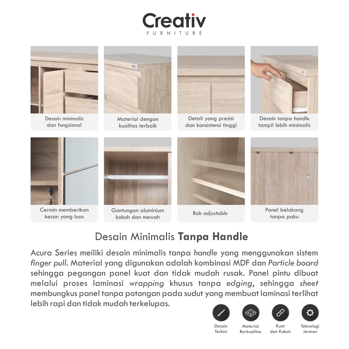 ACURA SB 120 merupakan sideboard minimalis yang dilengkapi dengan dua (2) rak dengan pintu dengan fitur handleless. Kamu dapat memanfaatkan rak untuk menyimpan barang-barang kesayanganmu. Dengan ukuran yang medium cocok dengan rumah minimalis masa kini. Dengan ACURA SB 120, kamu dapat menyimpan barang-barang kesayanganmu dengan nyaman dan aman.